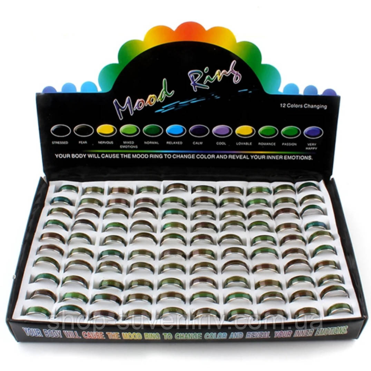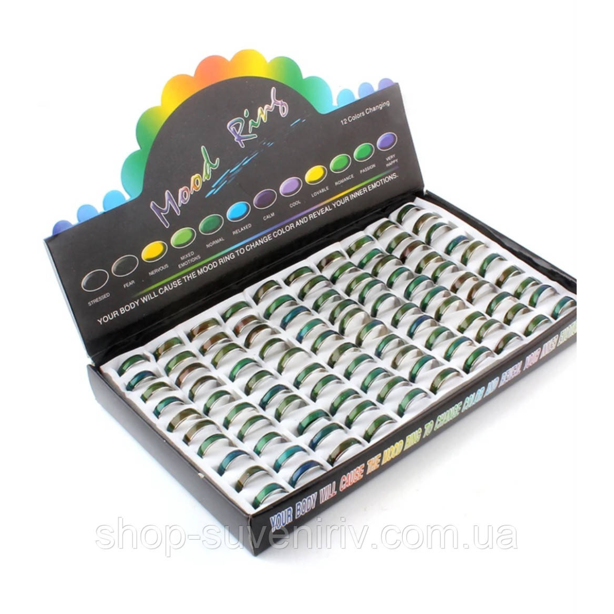 Перстень виготовлено з металу в кольорі срібло, ефектності зовнішньому вигляду додає накладка з металу чорного кольору з написом молитви. Дане кільце є своєрідним індикатором самопочуття, оскільки змінює колір на один з 12 можливих кольорів в залежності від настрою і температури тіла людини, що носить дану прикрасу. Виріб має широку розмірну сітку, тому підібрати перстень, який буде оптимальним за розміром і подарує відчуття комфорту - легко і просто. В упаковці знаходиться 100 перснів.