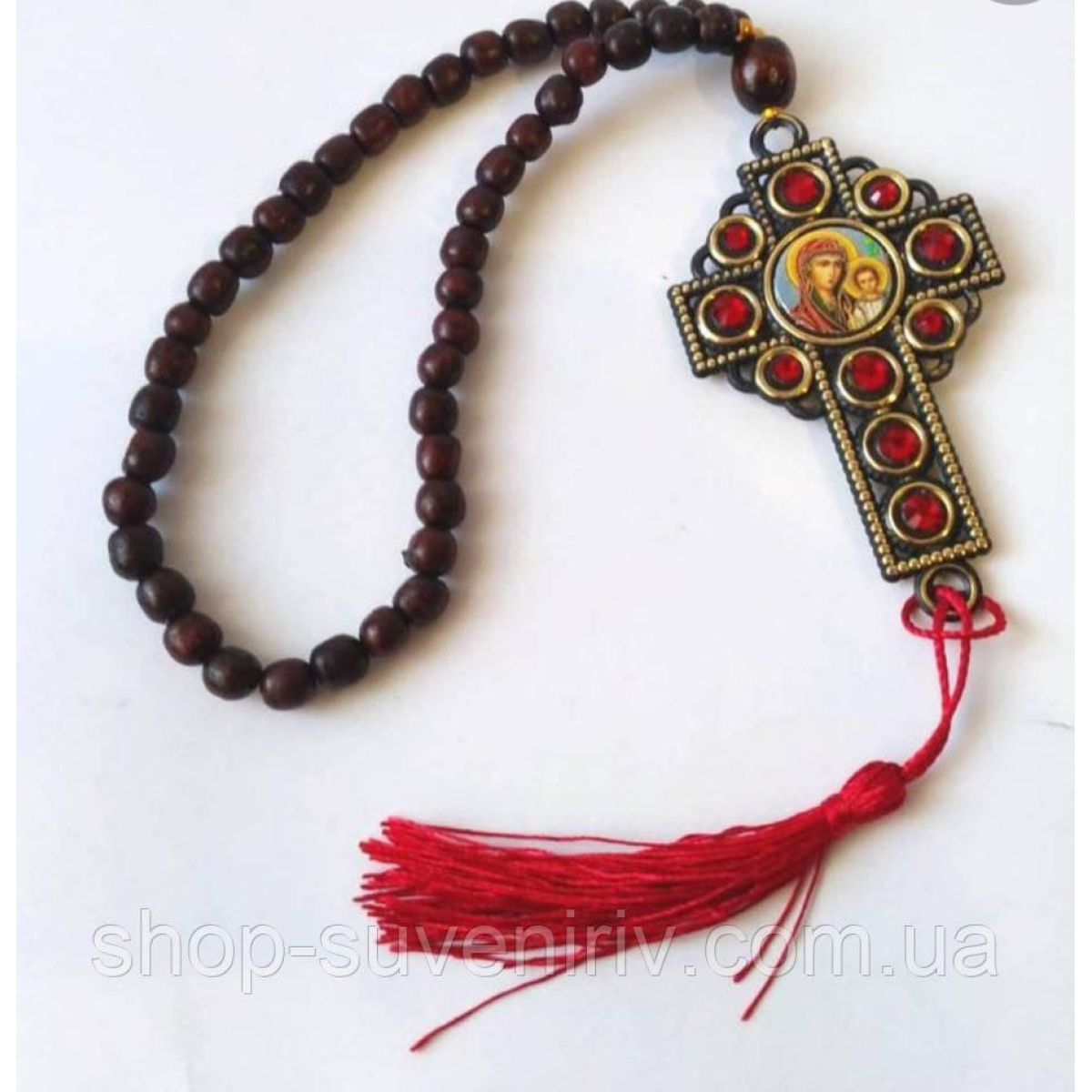 Дерев“яні чотки з гарним хрестом в машину. Автомобільна іконка оберіг з чотками і великим хрестом з іконою.. Відмінний подарунок кожному автолюбителю - підвіска в автомобіль чотки з іконою. Два в одному - і чотки, і ікона. Ікона двостороння, масивна. Іконки є оберегами, які захищають від всіляких невдач, саме тому водії автомобілів часто використовують їх в салонах своїх машин. Для цього можна купити ікону або придбати таку невелику підвіску. Виріб має оригінальний вигляд, виготовлено майстрами Гуцульщини і складається з іконки, наклеєної на дерев“яну заготовку круглої форми. Оберіг доповнено чотками з хрестиком, декорований пензлем з ниток, покритий лаком.
