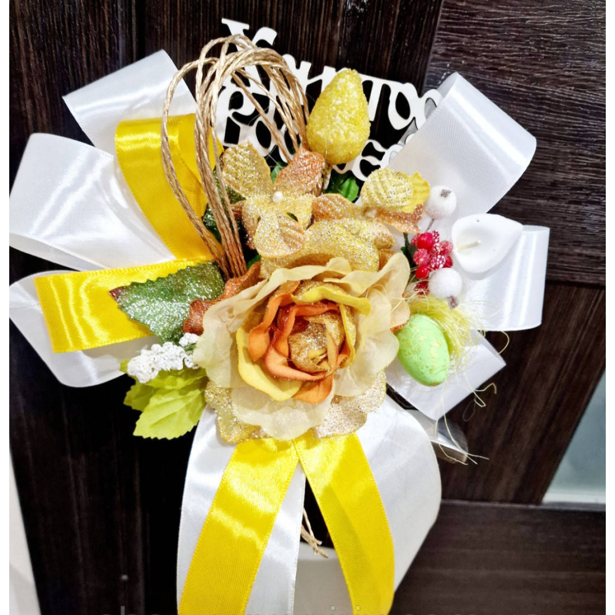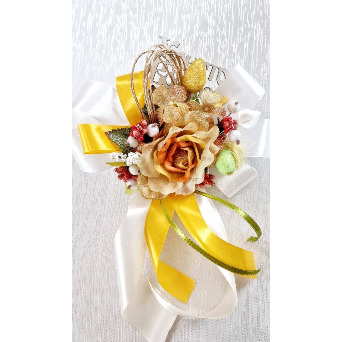 Ця чудова прикраса для великоднього кошика зроблена з атласних стрічок у техніці канзаші. Композицію доповнюють декоративні ягоди та комахи. Кожен елемент цього чудового великоднього декору з квітами зроблений з любов“ю та турботою. Прикраса кріпиться до кошика за допомогою широкої атласної стрічки. Для надійного кріплення додатково можна закріпити за допомогою вузьких стрічок.